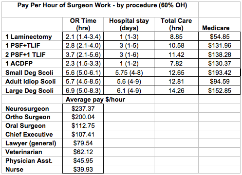 Operative times: lami- 2.1 hrs (1.4-3.4hrs), PSF/TLIF- 2.8 hrs (2.1-4.0hrs), 2 level PSF/TLIF- 3.7 hrs (2.1-5.6hrs), ACDFP- 2.3 hrs (1.5-3.3hrs) SDS-5.6 hrs (5.0-6.1hrs), IS–5.7 hrs (4.5-8.5hrs), LDS–6.9 hrs (5.0-8.3hrs). Hospital length of stay: Lami- 1 day (1-3days), PSF/TLIF- 3 days (1-5days), 2 level PSF/TLIF- 3 days (1-6days), and ACDFP- 1 day (1-2days), SDS–5.75 days(4-8days), IS-5.6 days(4-9days), LDS–6.1 days(4-9days). Total care time: Lami- 8.85 hrs, PSF/TLIF- 10.58 hrs, 2 level PSF/TLIF - 11.42 hrs, ACDFP - 7.82 hrs, SDS-12.65 hrs, IS–12.81 hrs, LDS-14.26 hrs. None of these surgeries paid spine surgeons equal to average neurosurgeon or orthopedic surgeon pay per hour. See table for reimbursement results.